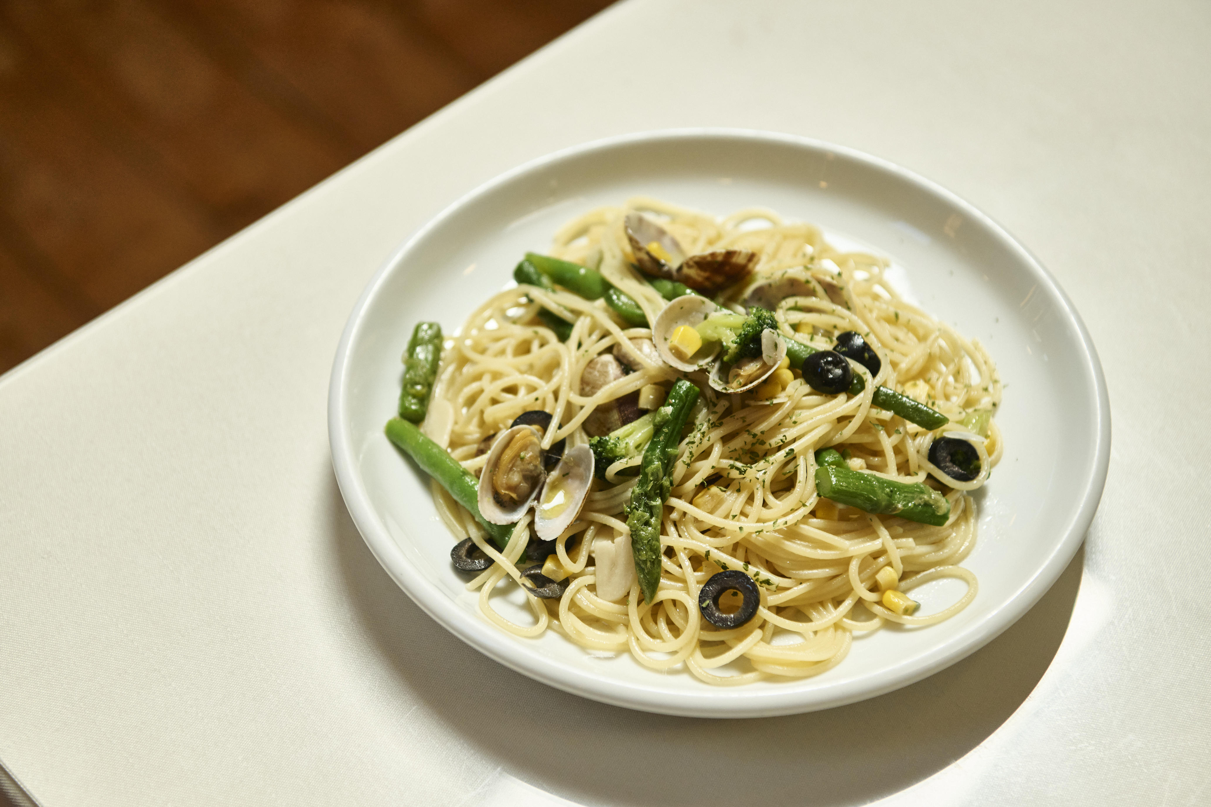 近郊で採れた旬の野菜(アスパラ、いんげん、ブロッコリー)を使ったパスタ。