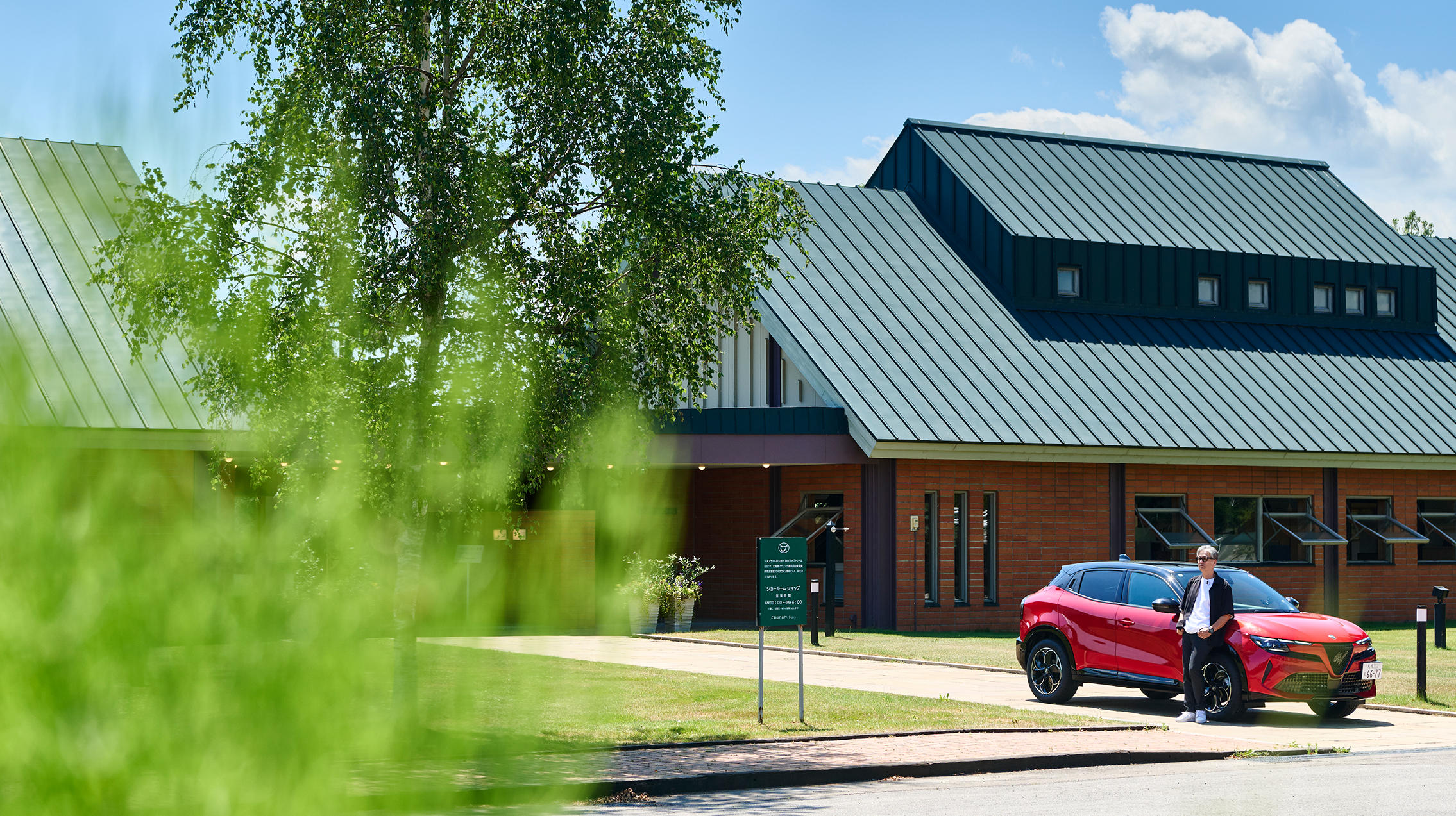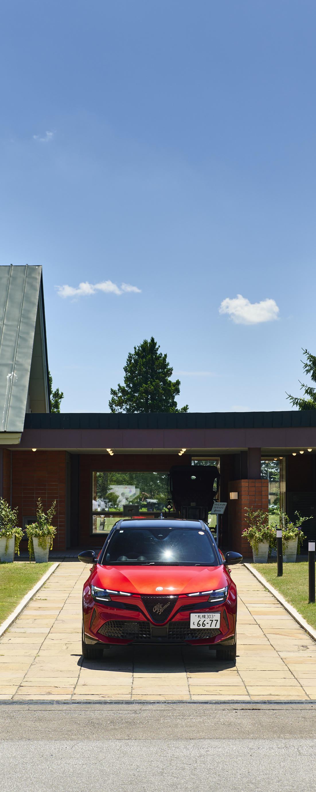 重厚な建築と緑の絨毯、そしてアルファ ロメオの気品あるレッドが、夏の青空によく映える。