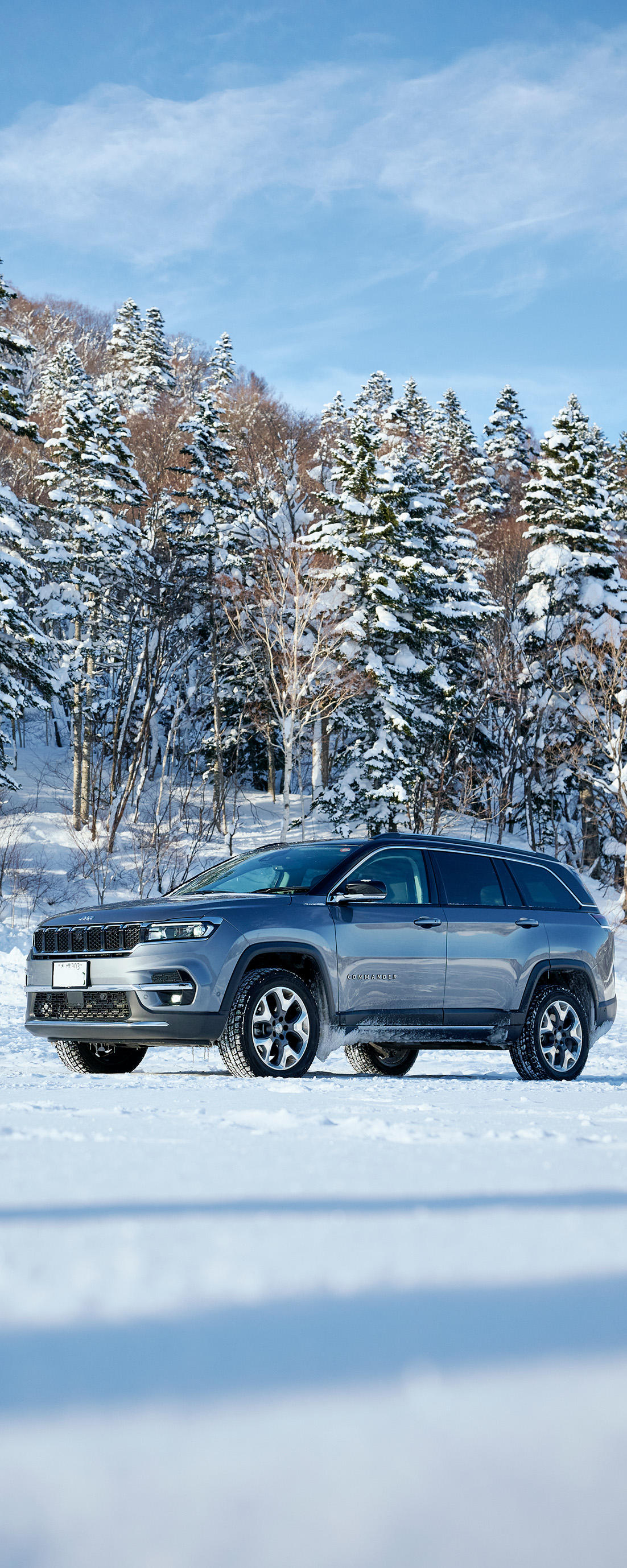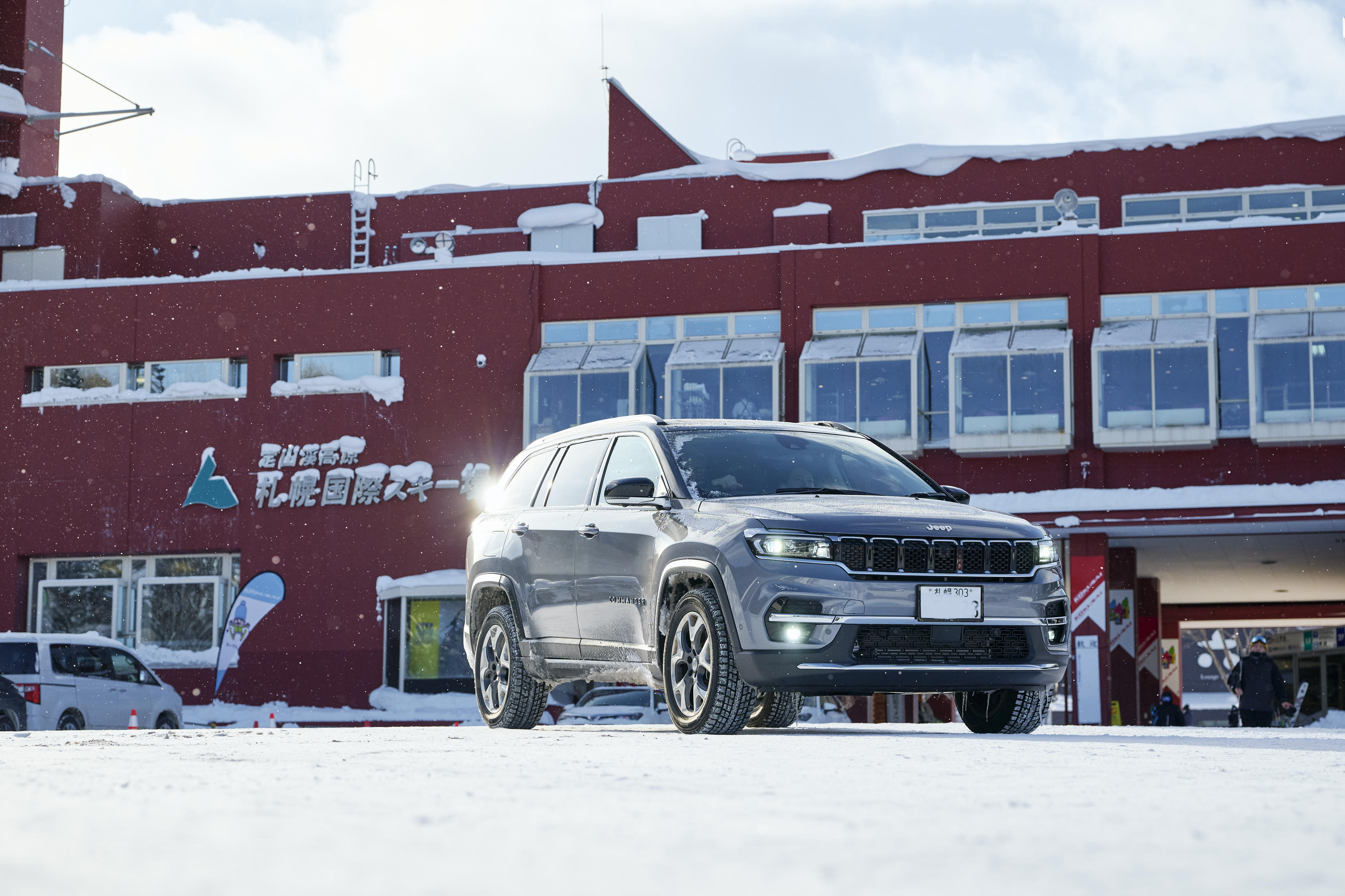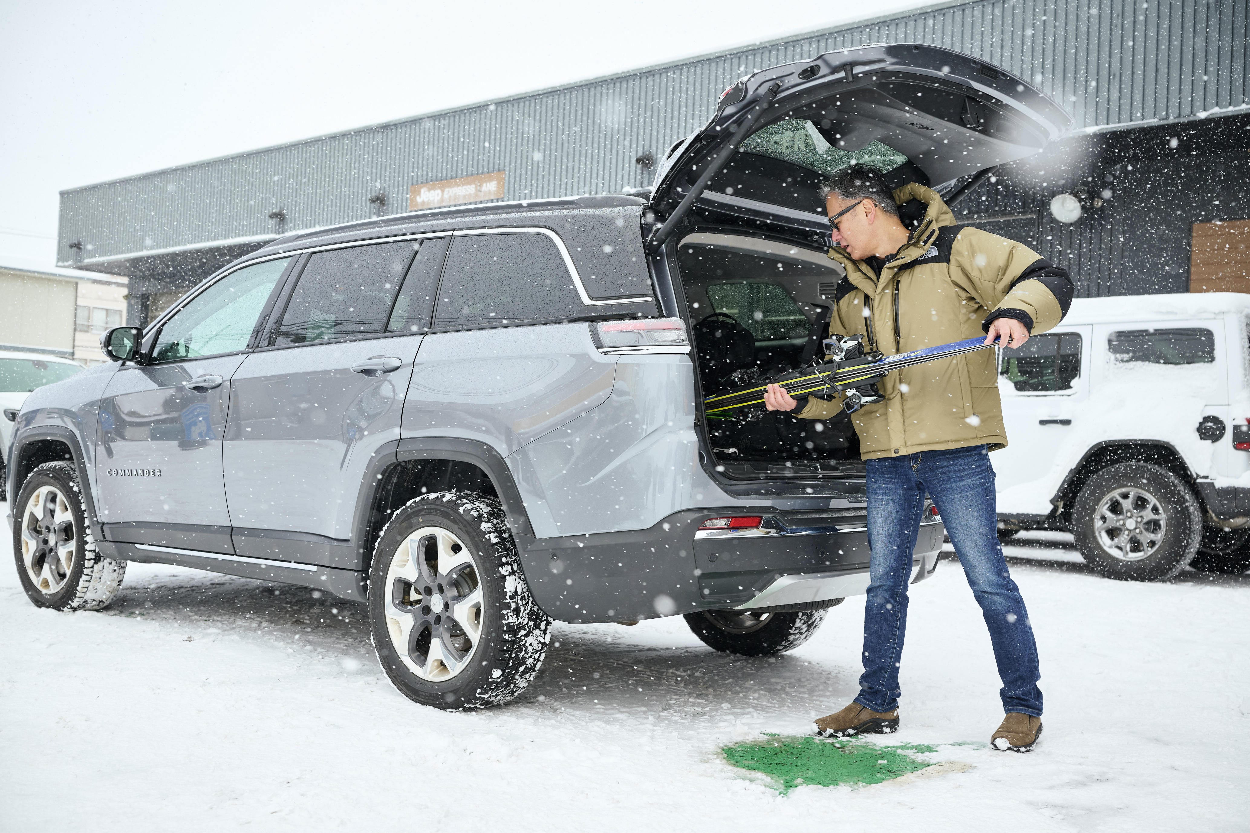 今回のスキーの相棒はジープ・コマンダー。ジープ伝統のタフな走破性を受け継ぎながら、7人乗車が可能なモデル。3列目のシートを倒せば、スキー板を車内に積み込んでも4名がゆったり乗車できる。SUVらしいヘビーデューティーなスタイルに加え、安心感のある4輪駆動パフォーマンスも魅力。リアバンパー下で足を動かすだけで開閉できるハンズフリー・パワーリフトゲートを搭載。スキーを持ったままでも使いやすく、まさに”スキーのための一台”。